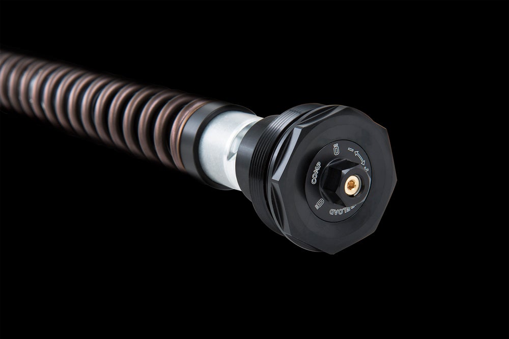 The front fork cartridge kit is divided into one compression cartridge and one rebound cartridge. The compression cartridge is installed in the left front fork leg and the rebound cartridge in the right front fork leg. Marked at the top cap is 'COMP' for compression adjustment and 'REB' for rebound adjustment.