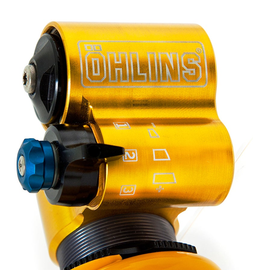 The updated shock’s blue trail high-speed compression valve now provides a wider adjustment range. Importantly, this gives the rider more distinct alternatives to choose between when customizing setup. This new wider range also adds support in the pedal mode, making the bike a more efficient climber. The golden DH compression valve retains the same adjustment range as the original, which is already perfectly optimized for gravity riding.